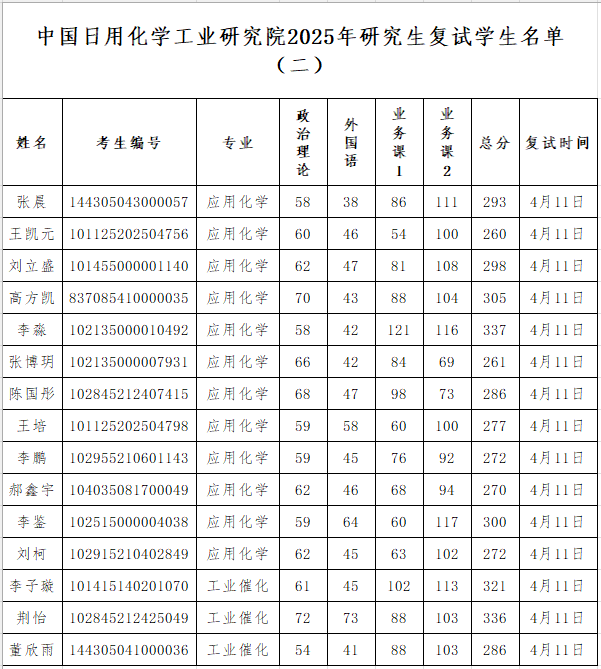 中國(guó)日用化學(xué)工業(yè)研究院2025年研究生復(fù)試學(xué)生名單