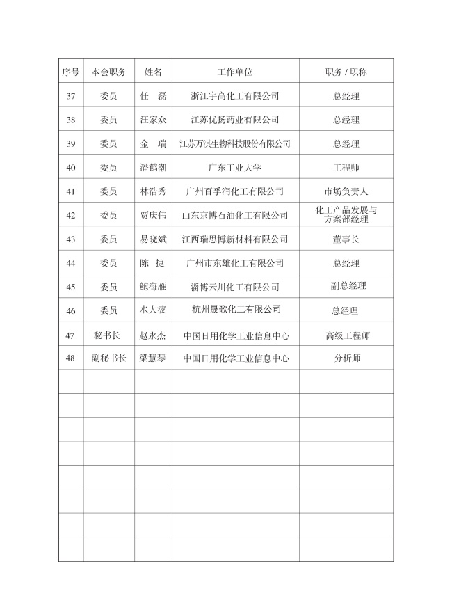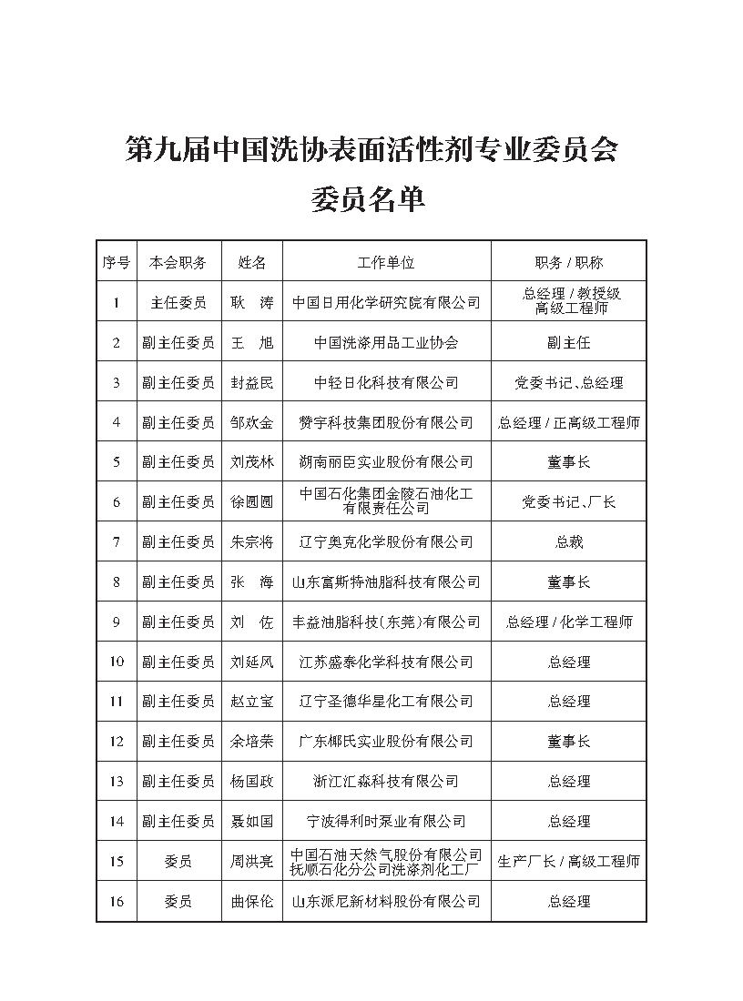 中國洗協(xié)表委會(huì)掛靠單位為中國日用化學(xué)研究院,具體工作由中國日化院信息中心開展實(shí)施。目前,第九屆表委會(huì)主任委員由中國洗協(xié)副理事長、中國日用化學(xué)研究院院長耿濤擔(dān)任,秘書長由中國日用化學(xué)工業(yè)信息中心高級工程師趙永杰擔(dān)任,副秘書長由中國日用化學(xué)工業(yè)信息中心分析師梁慧琴擔(dān)任。