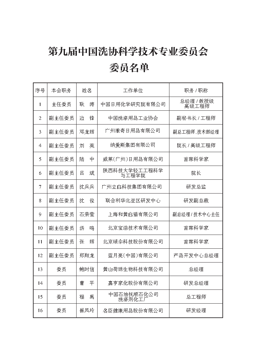中國洗協(xié)科技委掛靠單位為中國日用化學(xué)研究院,具體工作由中國日化院信息中心開展實(shí)施。目前,第九屆科技委主任委員由中國洗協(xié)副理事長、中國日用化學(xué)研究院院長耿濤擔(dān)任,秘書長由中國日用化學(xué)研究院科技處主任鞠洪斌擔(dān)任,副秘書長由中國日用化學(xué)工業(yè)信息中心責(zé)任編輯楊玉喜擔(dān)任。