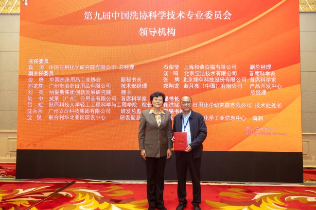 中國日用化學(xué)研究院院長耿濤向當(dāng)選的第九屆表委會(huì)副主任委員、秘書長、副秘書長頒發(fā)證書